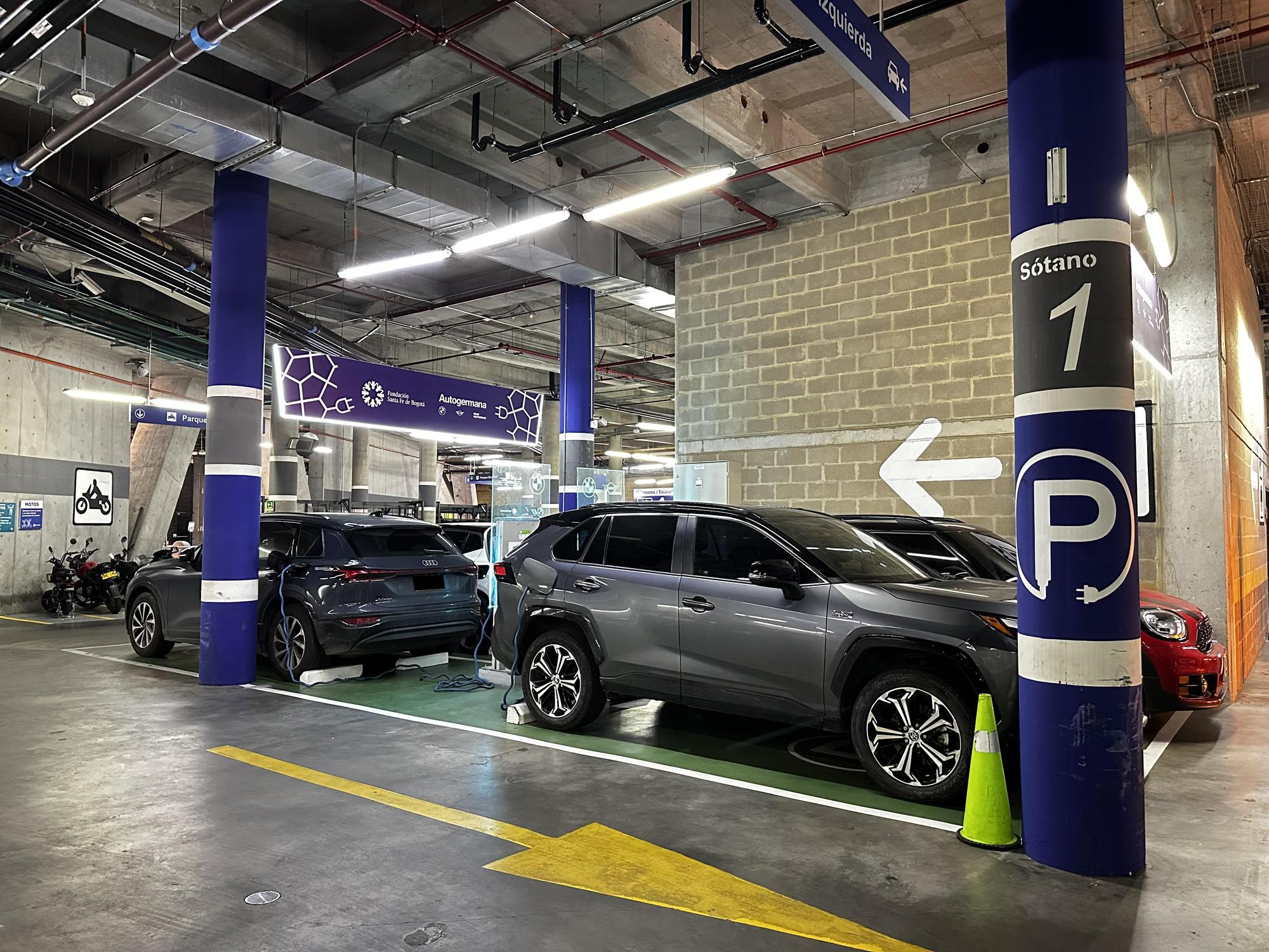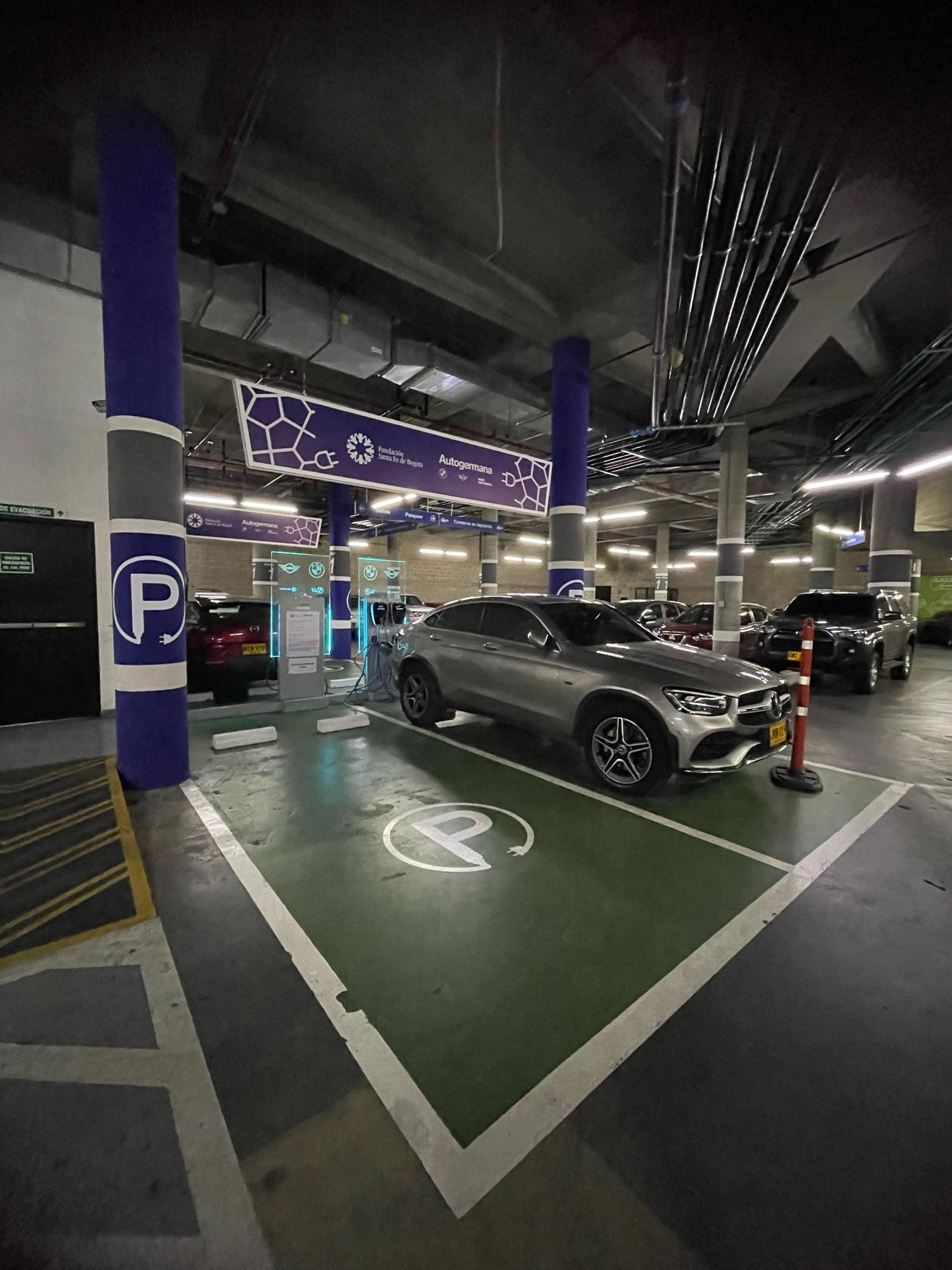 Cargador tipo 1 (J-1772) ubicado en el parqueadero de la Fundación Santa Fe, un importante hospital en el norte de Bogotá (Usaquén). Es un recurso invaluable para pacientes, visitantes o personal médico que necesitan recargar su vehículo eléctrico durante largas jornadas de consulta u hospitalización en el centro médico.